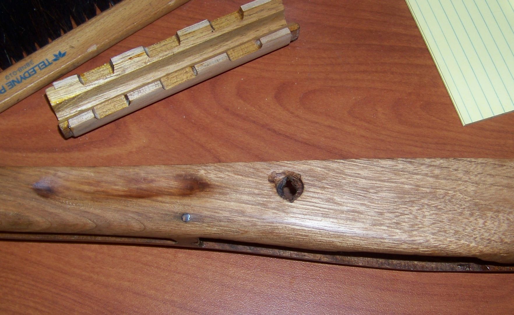 So I have this Chinese stock that the previous owner tried to remove the crossbolt by "unscrewing" it. He managed to screw up the wood around the bolt. I thought I could pretty much make it invisible but the damage was just too deep. So it has to go at a discount. I figure that somebody can use their own hardware so the price without hardware, stained and finished with polyurethane (I'm not going to spend hours putting 15 coats of finish on so it gets two or three of poly) is going to be $50 plus $10 shipping. OPTIONS are: handguard stained and finished to match +$10. Hardware "as is" which is a bit scratched from the pounding, +$10.