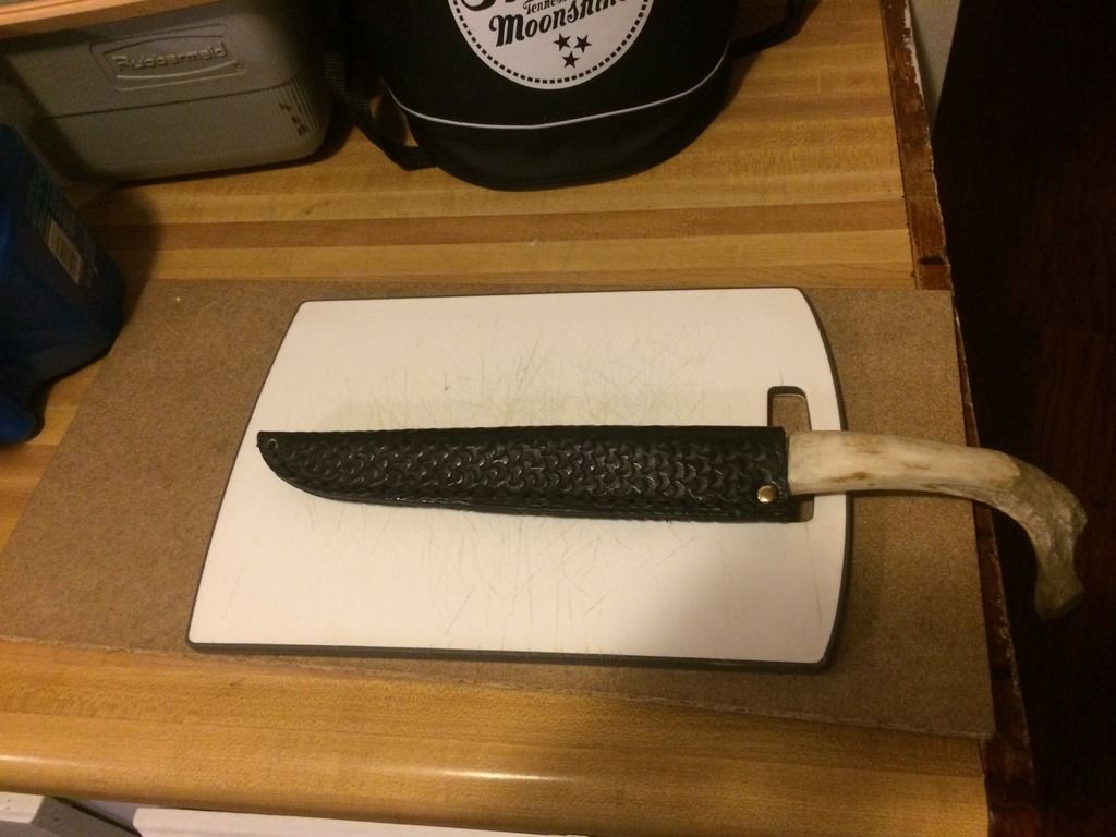 I made this about 2 years ago, the knife I am presenting is a left handed, bone handle, high tempered knife made out of a file, beef bone,"Rib" over 12 inch blade. I know this looks crazy but thought at the time I would put myself to the test and see how much detail and time i could put in to it. The sheath is stamped leather to give it a scale like appearance.